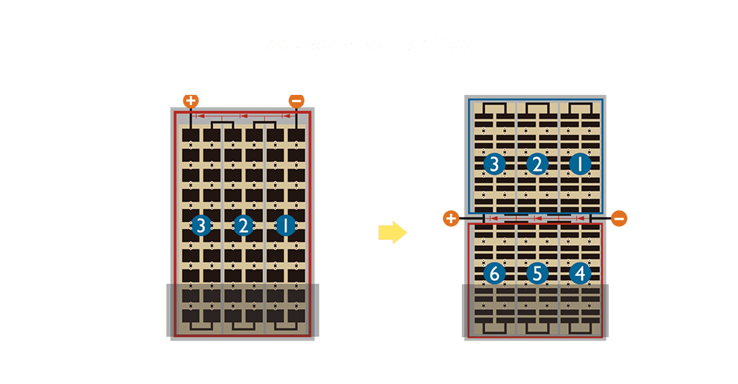 - 电池使用多条铜导线 (Copper wire) 于电池片上形成较短的电流路径,,,,提高电流收集效率,,,,采用圆形设计的铜导线较传统扁平式的铜焊带 (Ribbon),,,,可增加入射至电池的光线量。。