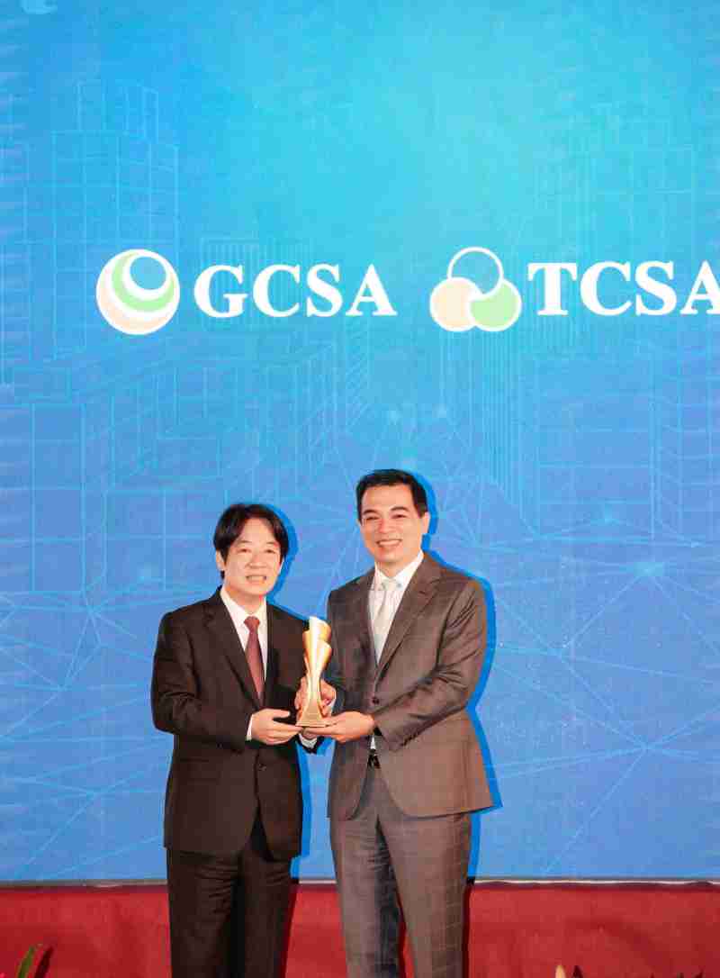 达全方位永续表现获全球永续奖及台湾永续奖肯定,,,,由副总统赖清德颁奖 (左),,,,银河集团总经理柯富仁 (右) 代表领奖