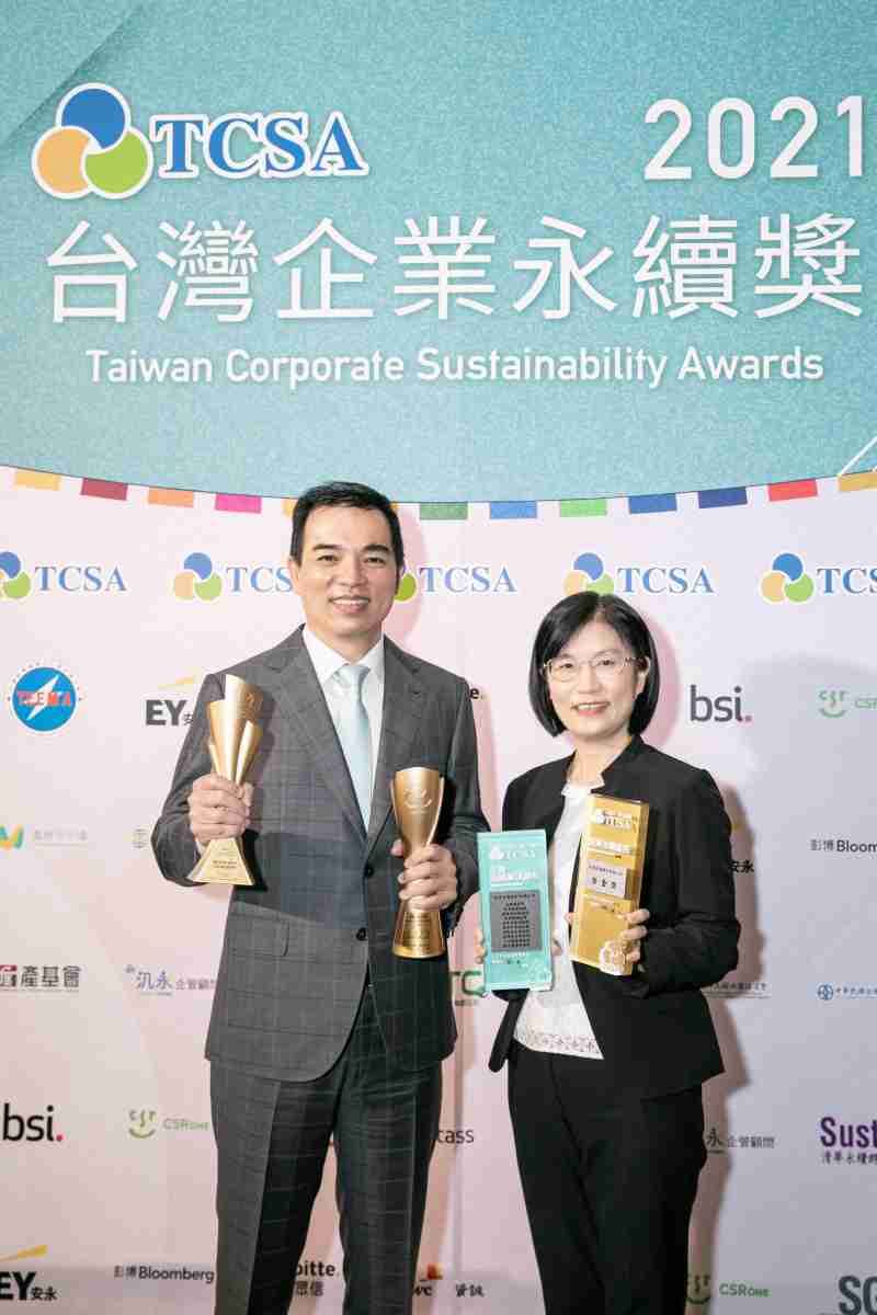 达在台湾永续奖所评比环境、、、社会、、治理等各面向的永续绩效均获高度肯定 (左:银河集团光电总经理暨营运长柯富仁,,右:银河集团光电永续长古秀华)